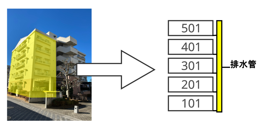 各世帯の台所、トイレ、洗面所の排水を棟外に排出する管の交換または、改修を行う工事になります。対象は、縦方向の排水管になります。模式図では外側に表示されていますが、宅内にて一部内装を取り壊しての工事(完了後に復旧)になります。