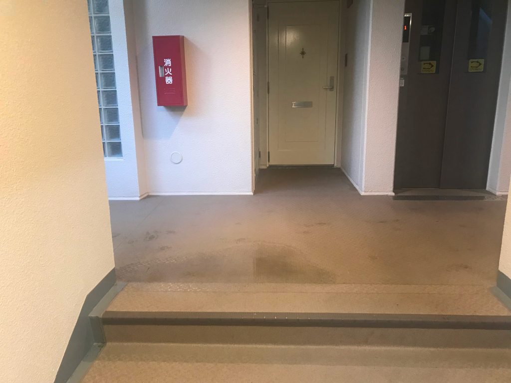 2022年8月13日に、1号棟西の1回エレベータ前に天井から滴り落ちた水によって、水たまりが、漏水ではないかとの報告があった。
