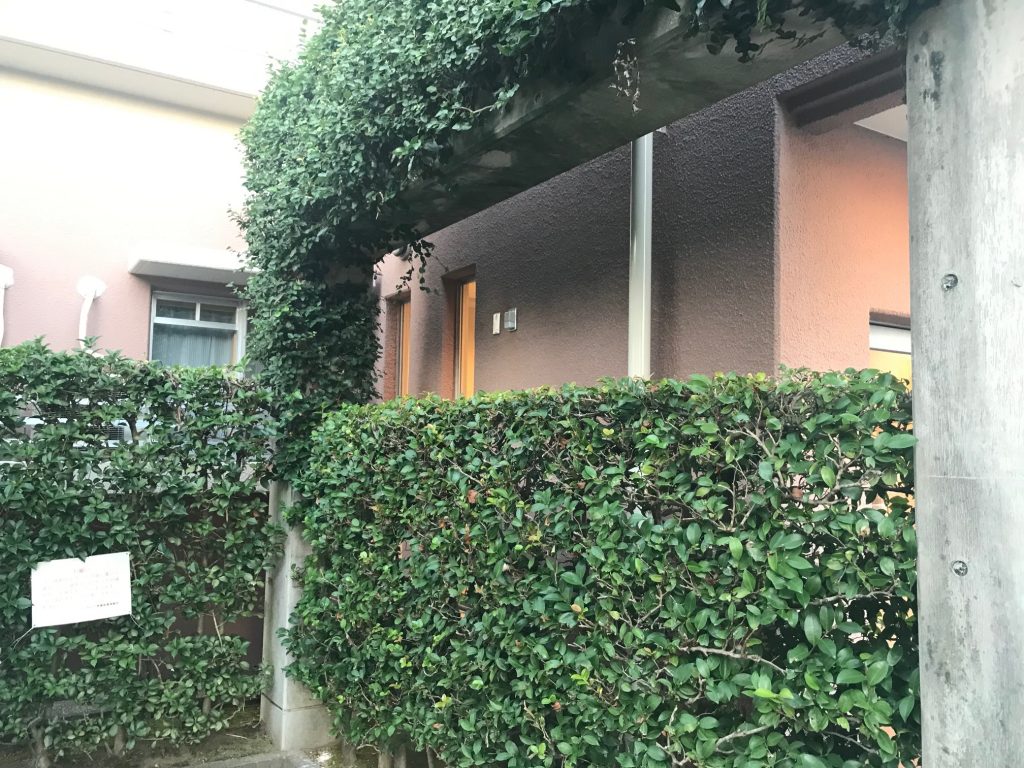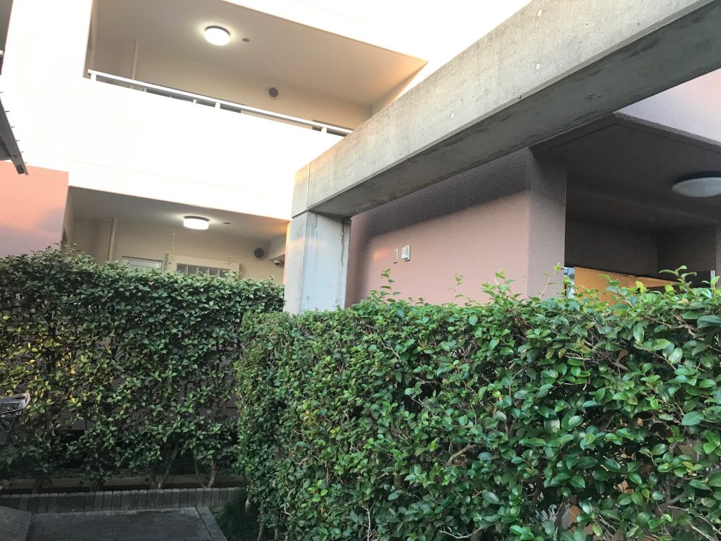 5号棟EEスイッチは、バーゴラ、蔦の影になって暗いので、照明は点灯している。